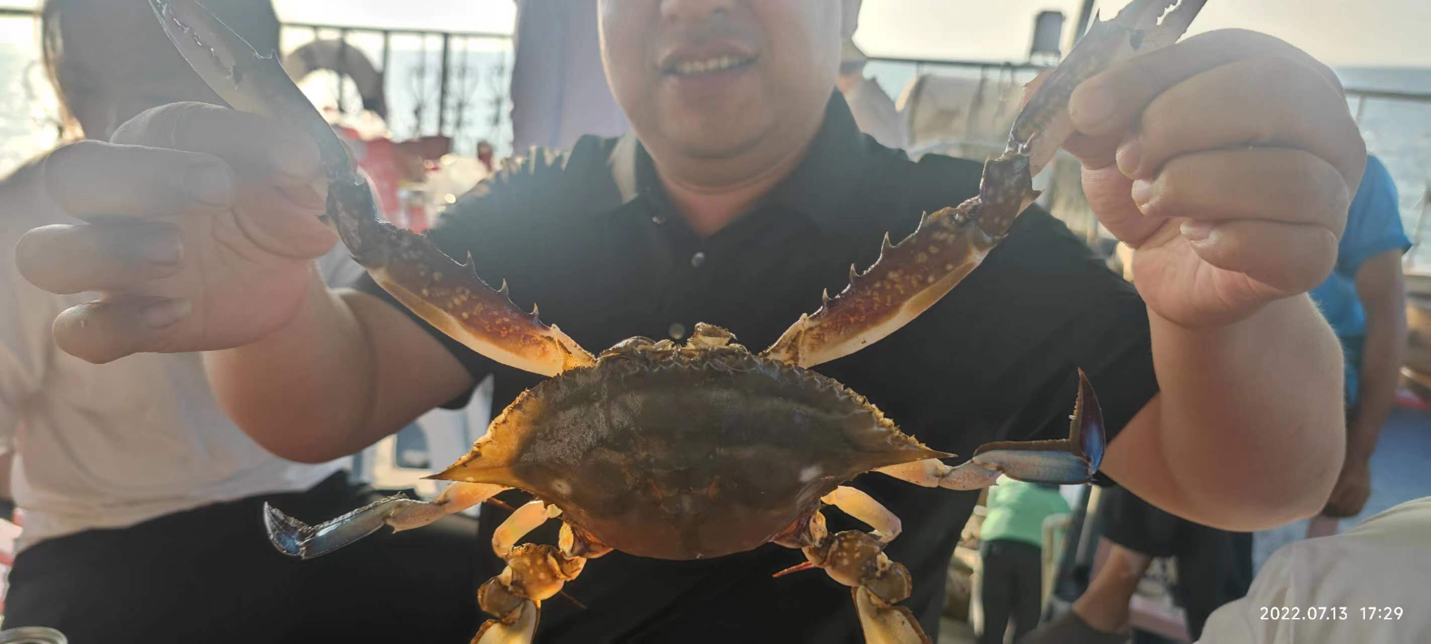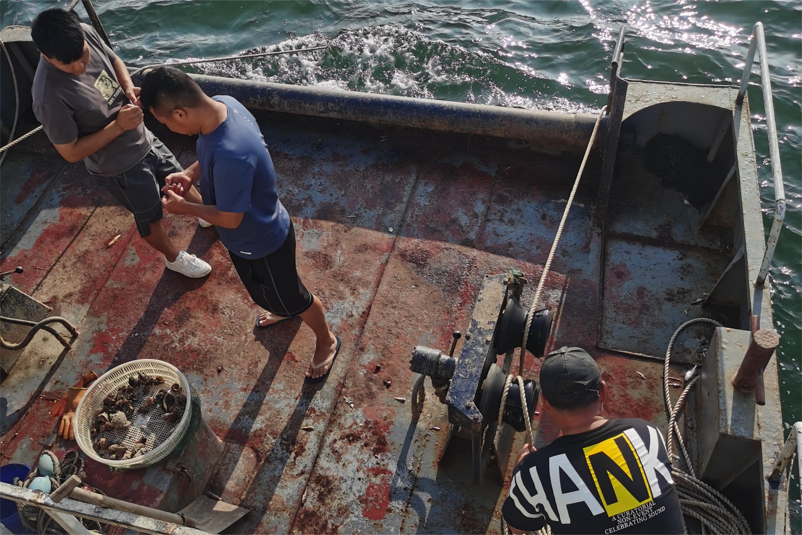 在大家满怀期待,千呼万唤中,一个又一个活蹦乱跳鲜活的海鲜哗啦啦的倒在船尾平台上,虽然渔货并不丰厚,但我们脸上都大写着开心。