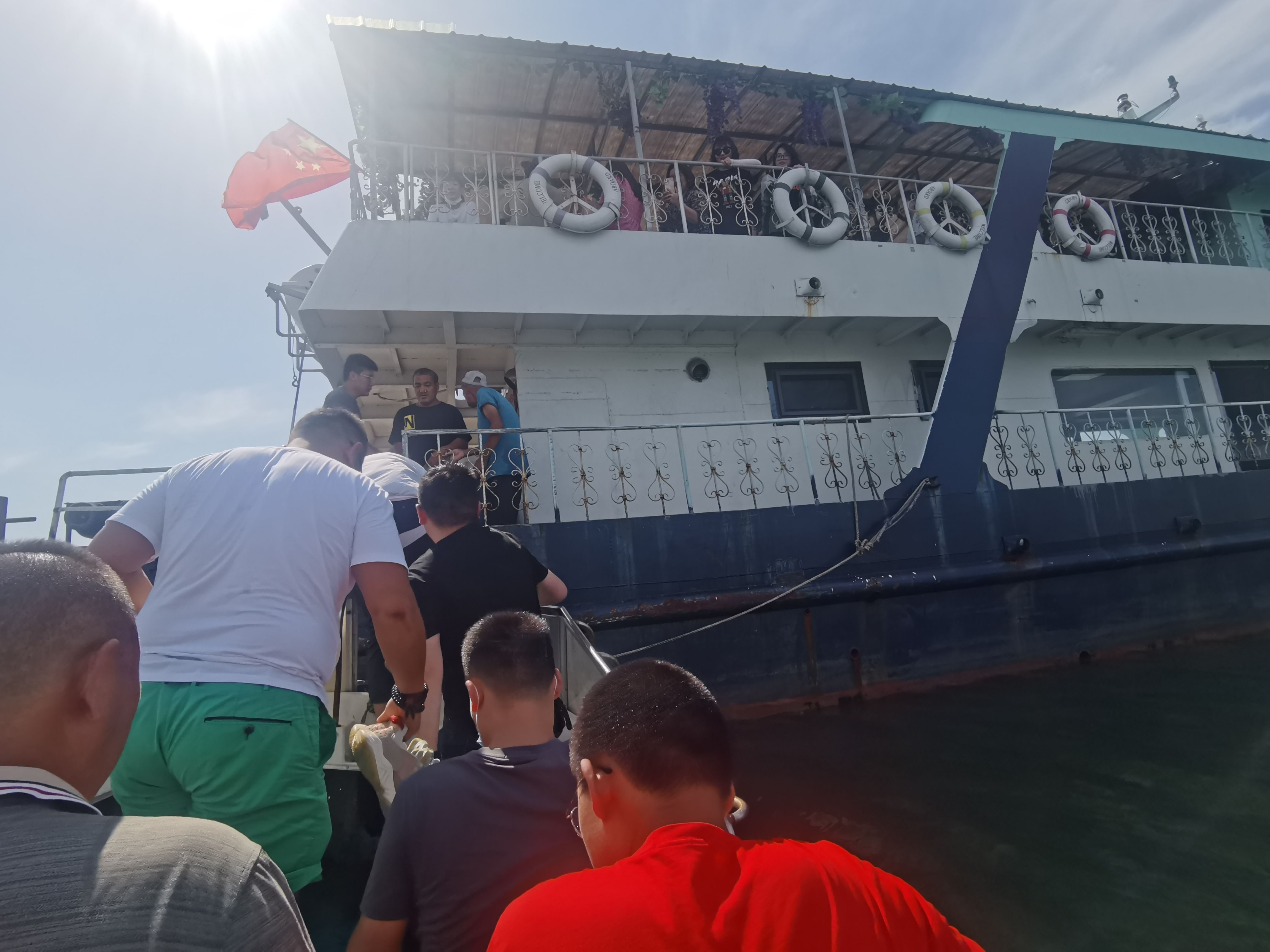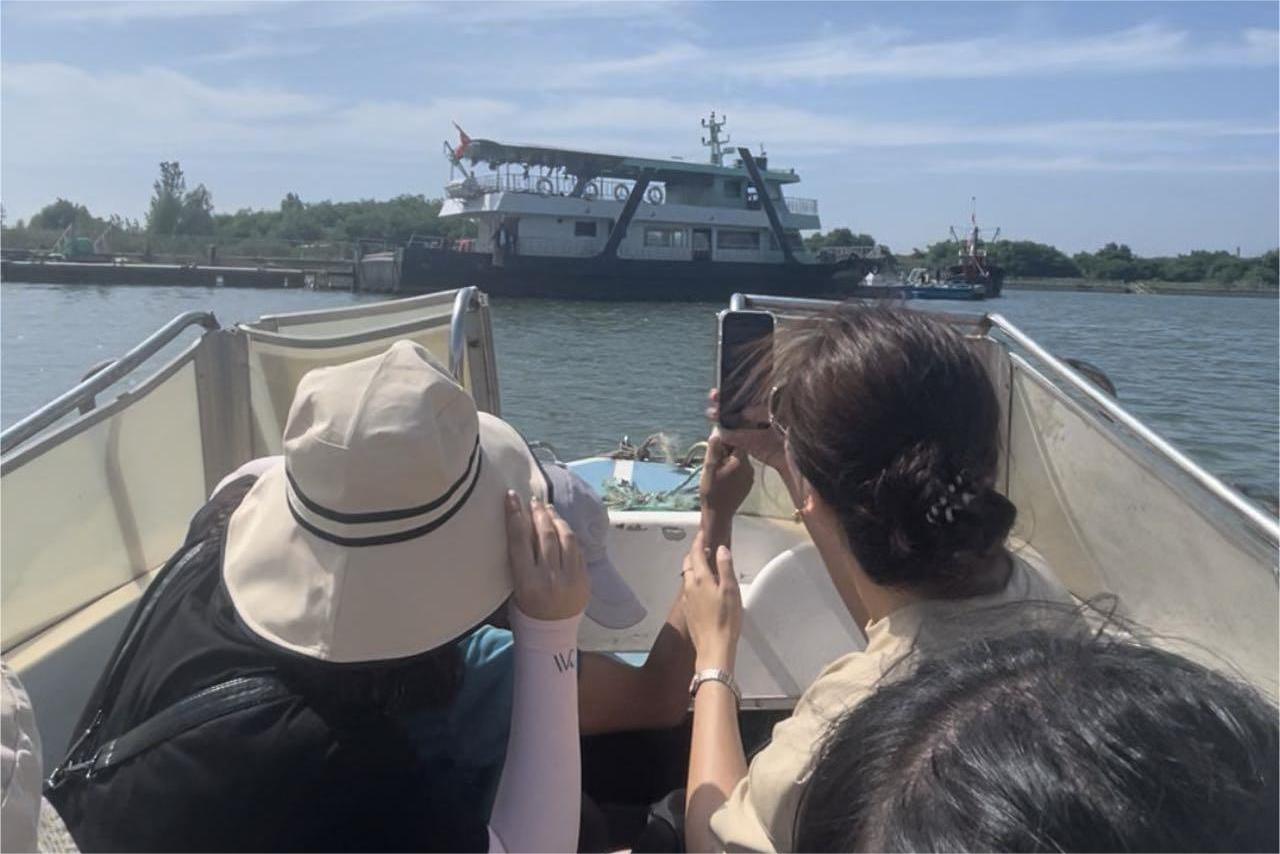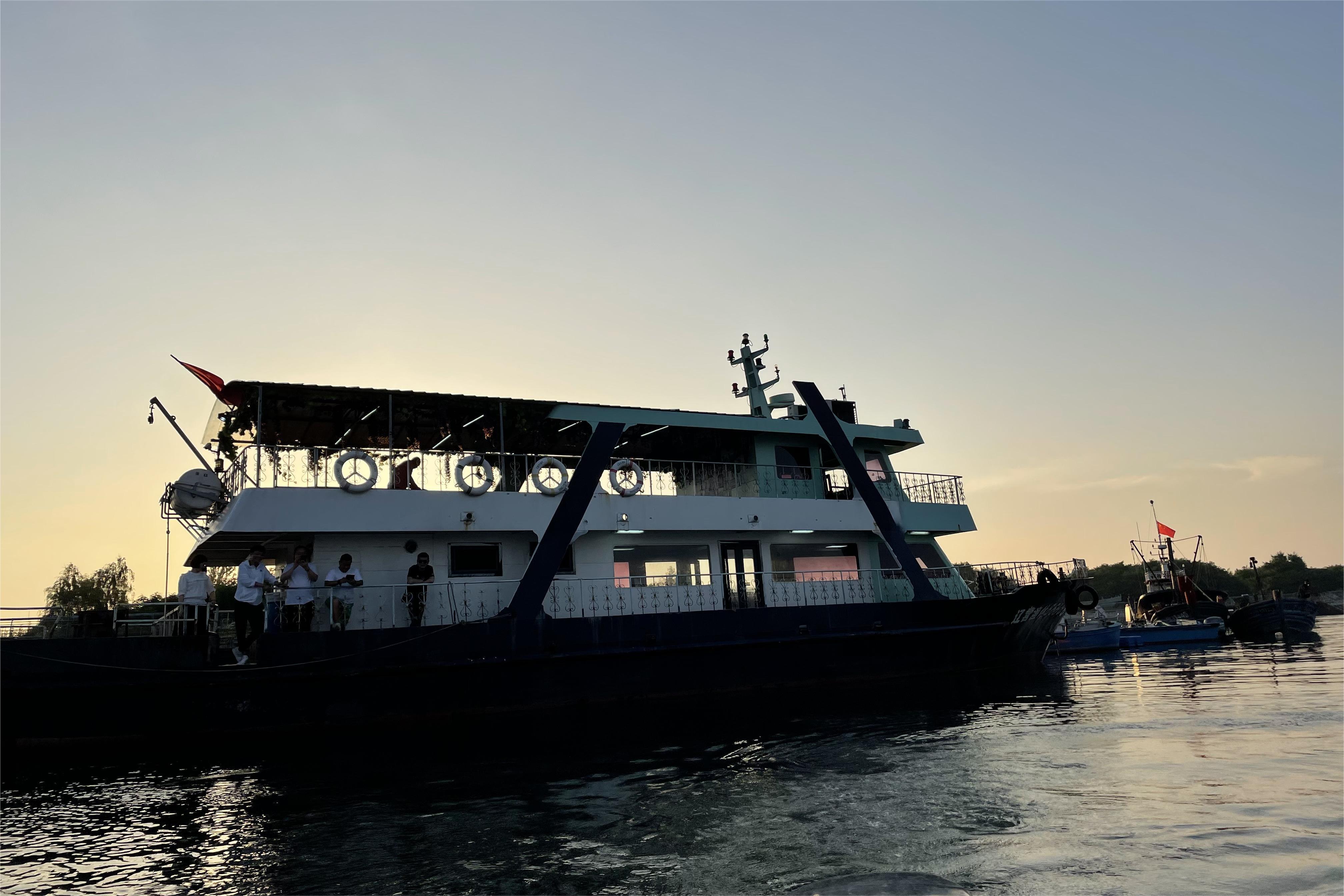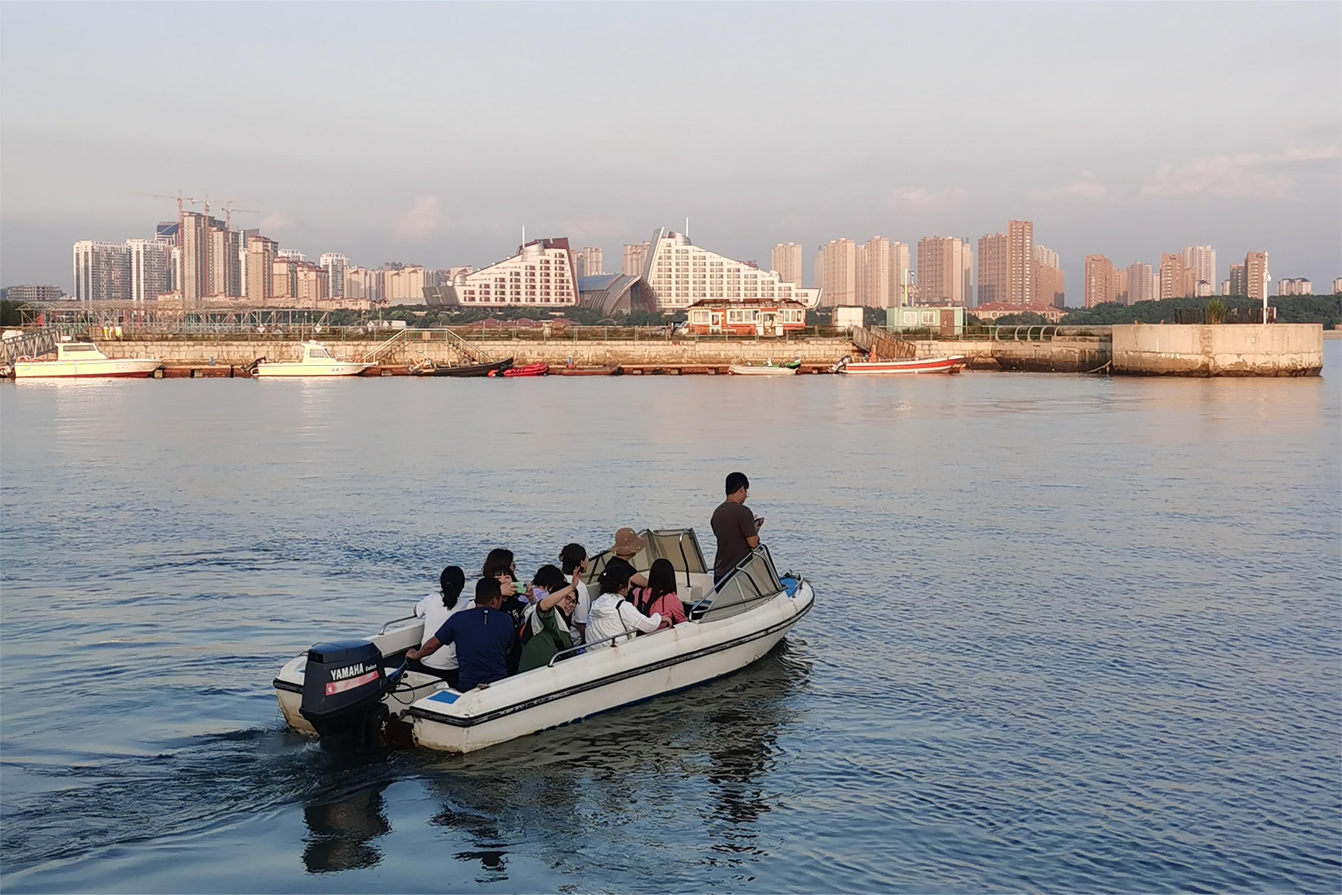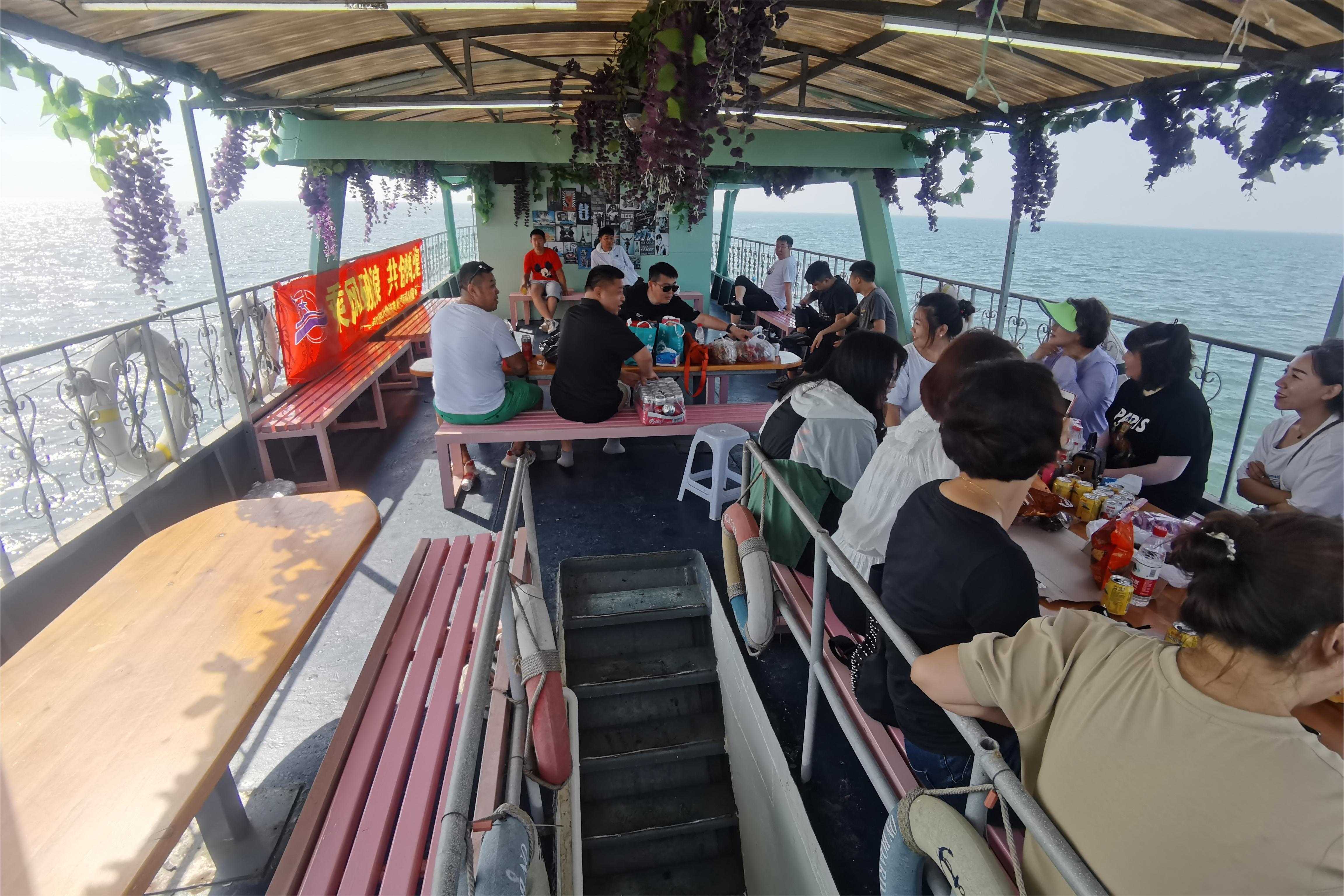 在船老大的指引下,我们经过海上浮桥乘快艇驶向远处的海中码头——金泰港码头,从码头登上了辽营渔休86888游船。