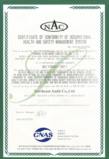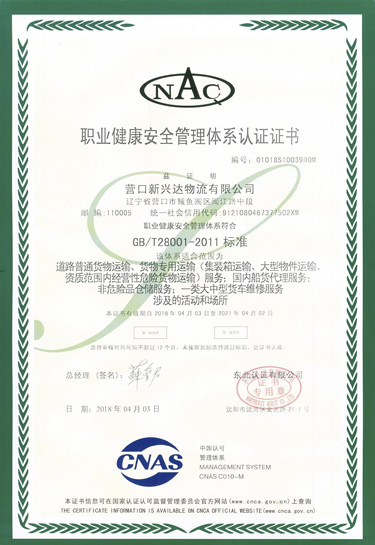 职业健康安全管理体系认证证书(中)